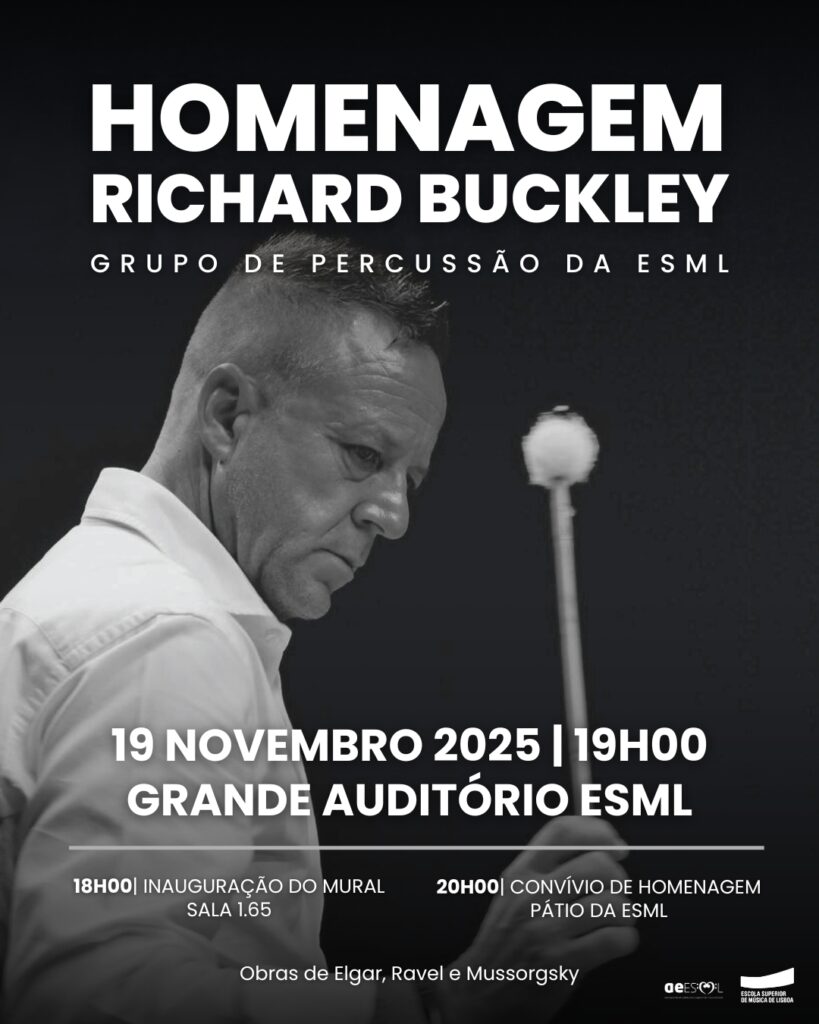 O Grupo de Percussão da ESML apresenta um concerto de homenagem ao nosso querido colega, Prof. Richard Buckley (1969-2025): in memoriam. O programa inclui transcrições de música orquestral, incluindo uma das obras favoritas do Prof. Buckley, um trecho das Variações “Enigma”, de Edward Elgar. No dia 19 Novembro, pelas 19h, no Grande Auditório da Escola Superior de Música de Lisboa (ESML). O evento inclui a inauguração de uma mural de homenagem, às 18h, assim como um convívio no pátio da ESML, às 20h.